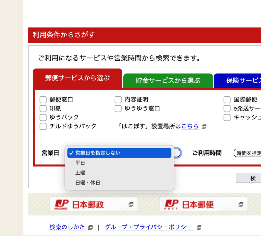 郵便局検索サイトの営業日を土日祝に設定して検索してみてください。